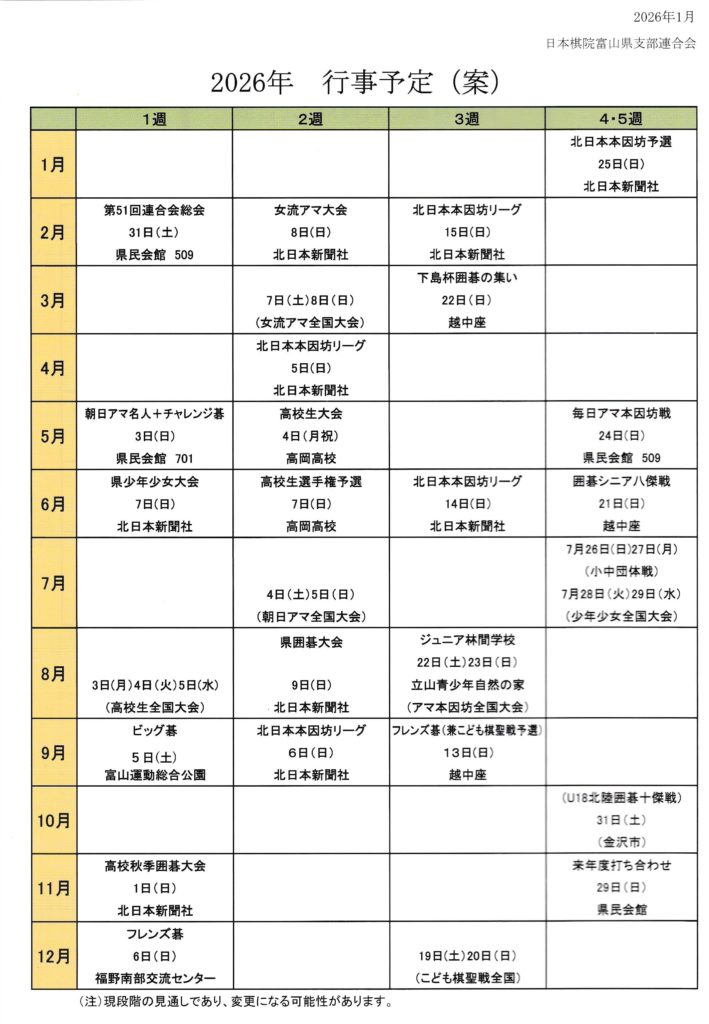 2026年 富山県囲碁 行事予定 (日本棋院富山県支部連合会)