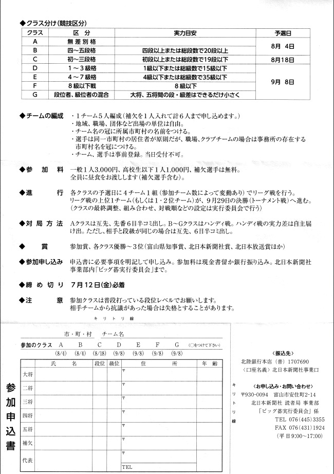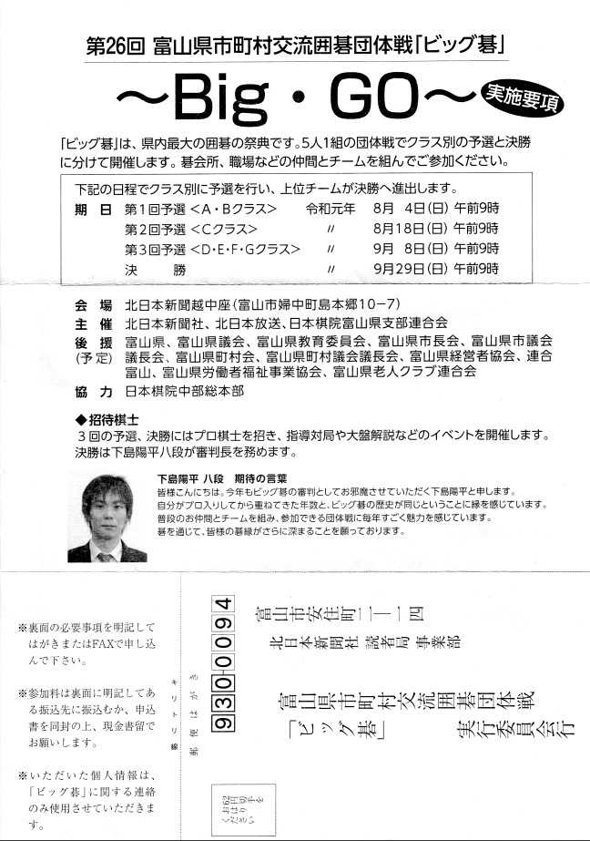 第56回全国「しんぶん赤旗」囲碁・将棋大会 新川地区(2019.9.15)富山地区(9.22)呉西地区(9.22) 富山県大会(2019.10.13) 全国大会(2019.11.9-10)