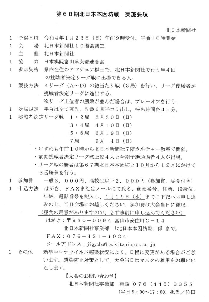 第68期北日本本因坊戦(2022.1.23)北日本新聞社