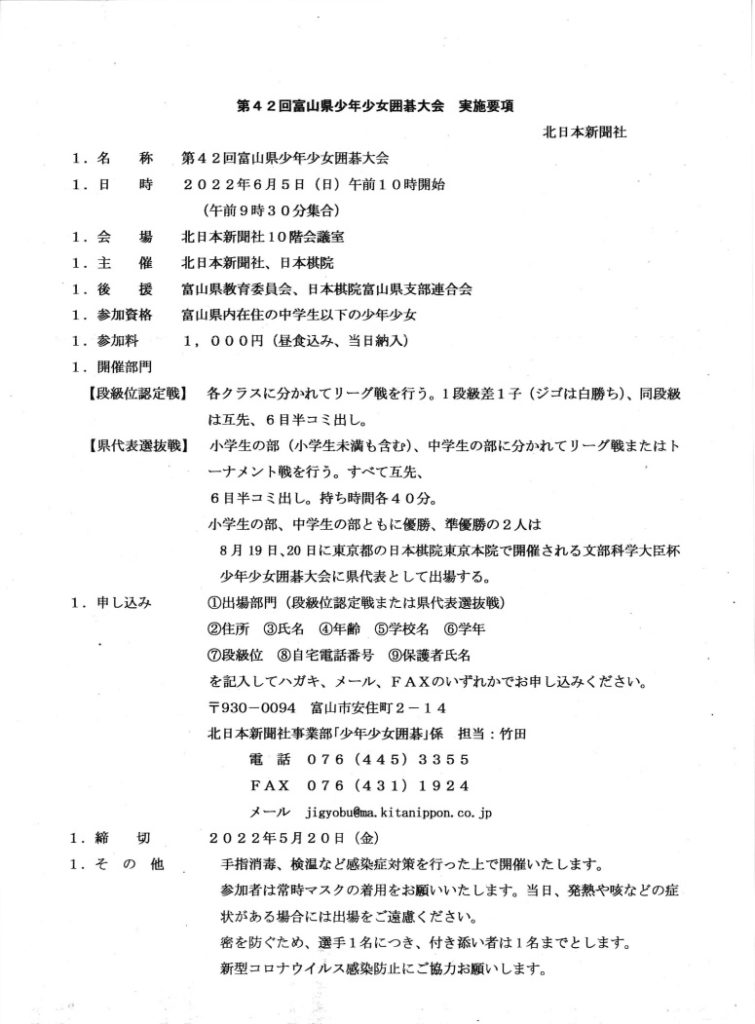 第42回富山県少年少女囲碁大会(2022.6.5)