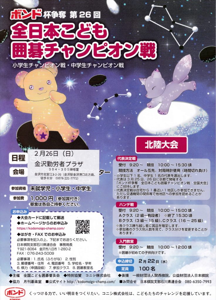 ボンド杯 第26回全日本こども囲碁チャンピオン戦・北陸大会(2023.2.26)