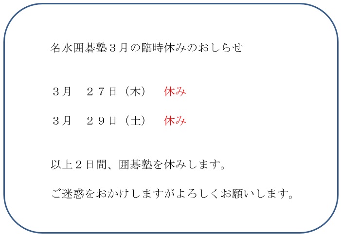 名水囲碁塾の臨時休みのお知らせ