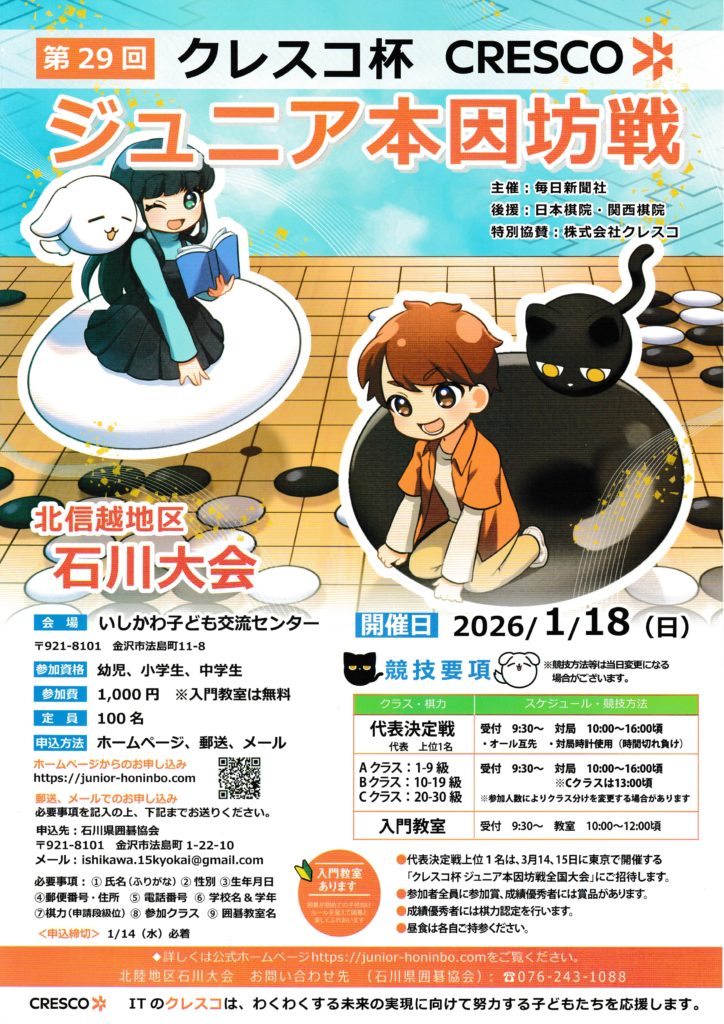 第29回クレスコ杯ジュニア本因坊戦(北信越地区石川大会)2026.1.18(日)